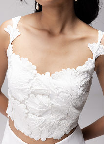 The Vesper Top is a delightful little thing. Fitted and minimal at first glance, it’s traced all over with white-on-white handcrafted cording in coral-inspired motifs.